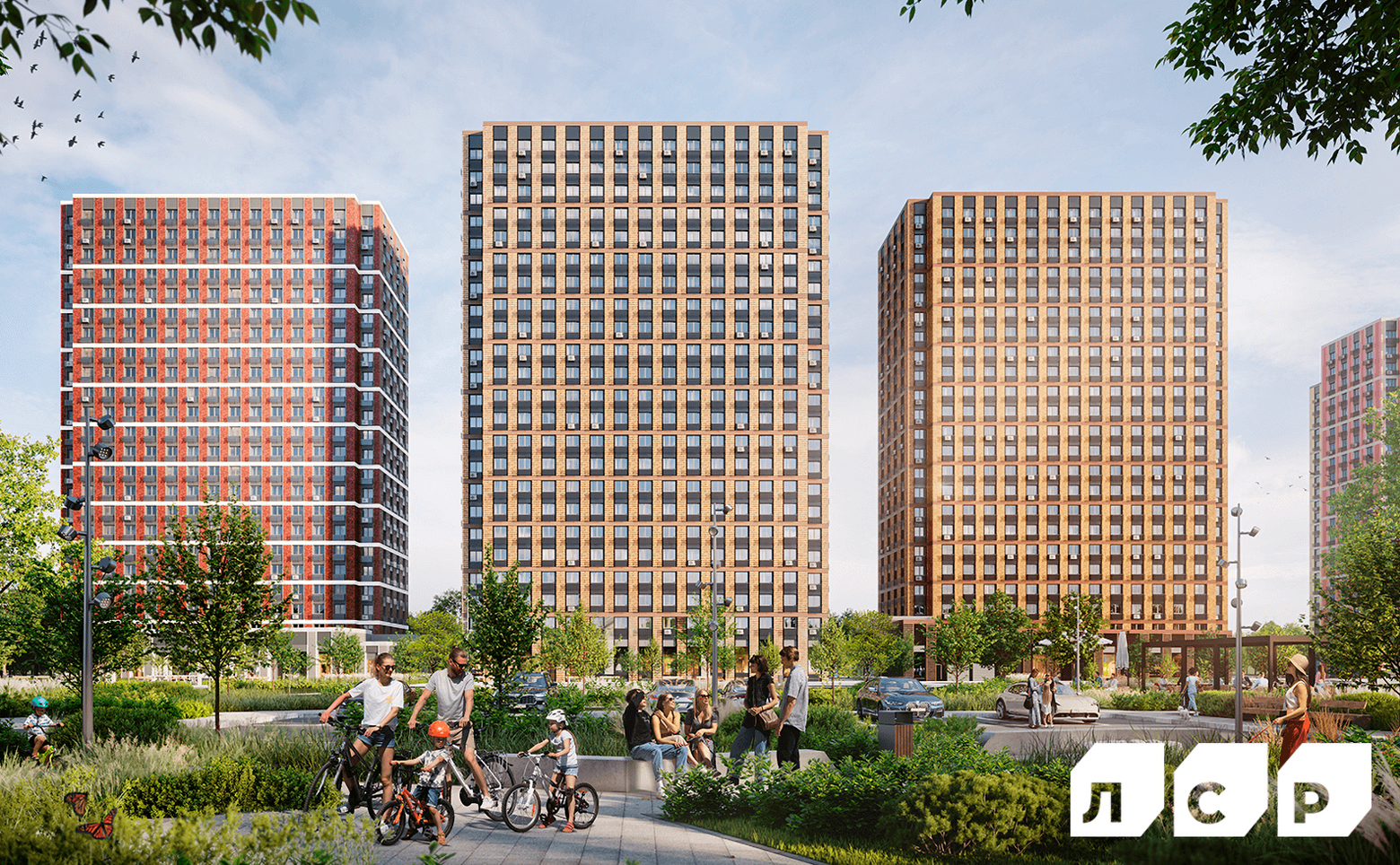 Территория комплекса огорожена и поделена на зоны активного и спокойного отдыха. Для занятий спортом предусмотрены различные тренажеры и комбинации для фитнеса. На детских площадках установлено современное игровое оборудование. Во 2-й очереди запроектирован собственный яблоневый сад площадью более 550 кв. метров, где будут высажены яблони разных сортов. Концепция сада получит развитие и на стилобатах между корпусами, что создаст уникальную обстановку за счет дополнительной площади. В стилобатной части запроектированы сквозные пешеходные арки, которые соединяют дворовое пространство и территорию «Битцевского леса». Особое место в концепции благоустройства занимает арт-объект — впечатляющий шар из нержавеющей стали, выполненный чешским архитектором Яном Бочаном в стиле конструктивизма.