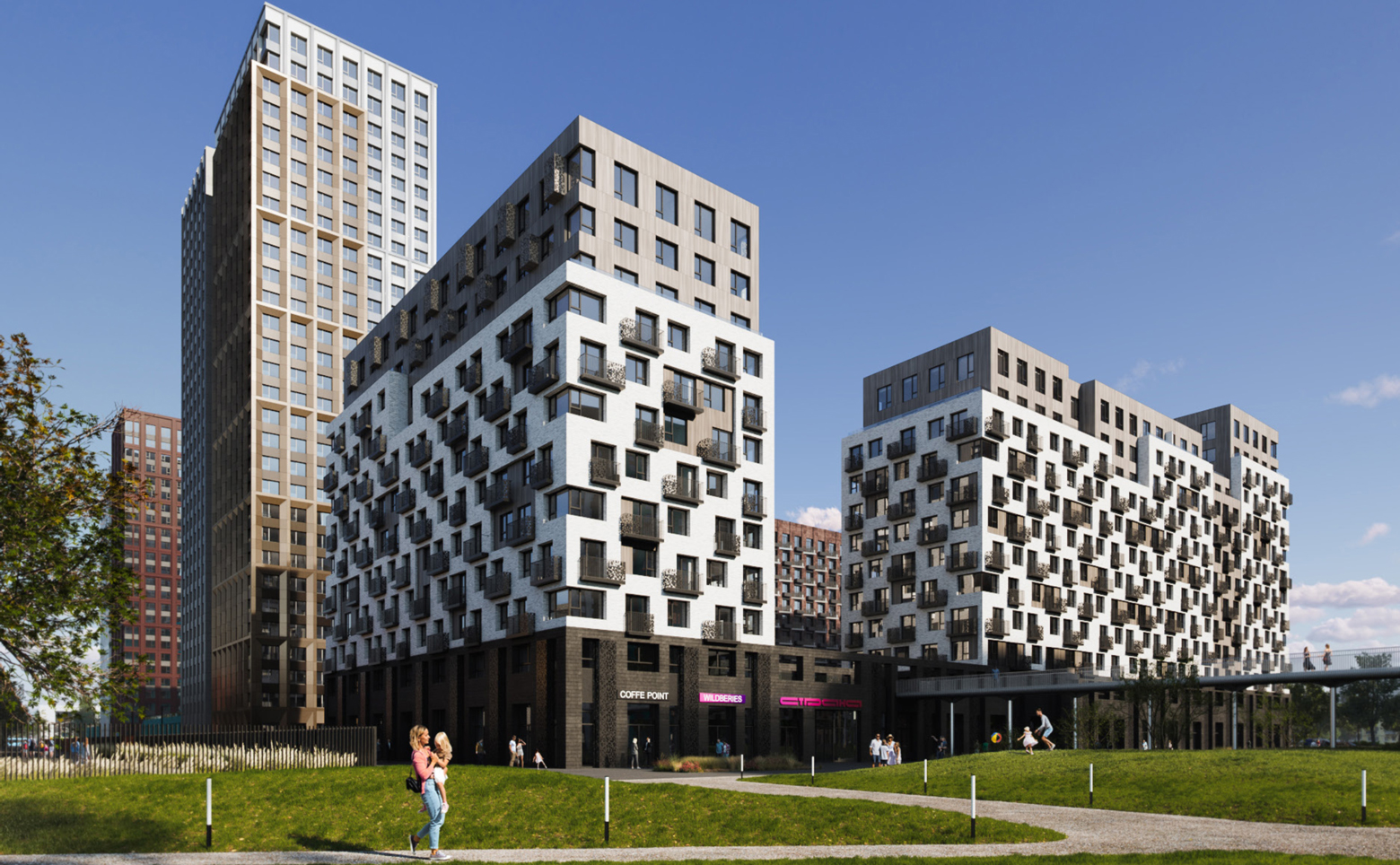 Жилой комплекс состоит из замкнутых кварталов переменной этажности и высотных башен с панорамными видами на реку и парковые зоны. Высота корпусов составляет от 12 до 38 этажей. Каждый корпус выполнен в индивидуальной стилистике с уникальными объемными фасадами. Комплекс построен по монолитной технологии, фасады зданий выделены наружной подсветкой. Во всех корпусах предусмотрено дизайнерское лобби с зонами ожидания.